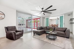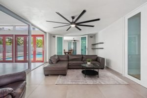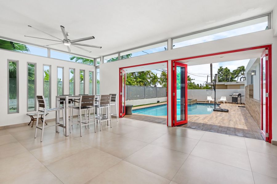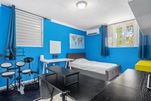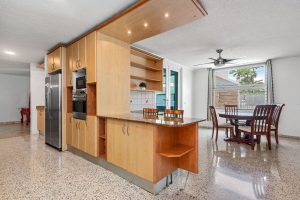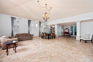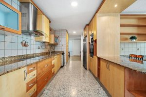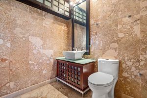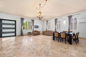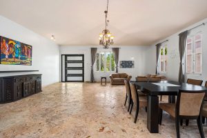 As you enter through the grand door, you are greeted by vast living and dining areas with a stunning high ceiling that allows the entrance of abundant natural light. This open space is perfect for entertaining guests or enjoying lovely evenings with family. The kitchen has custom mahogany wood cabinetry and granite countertops.