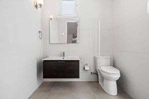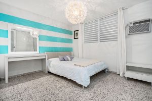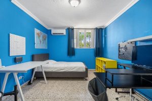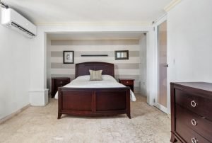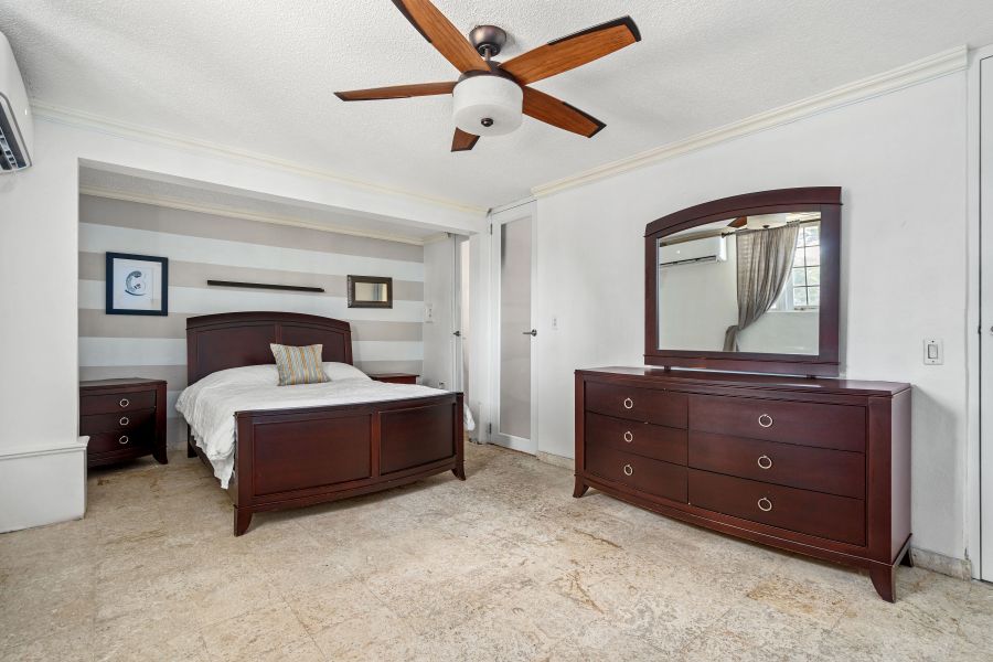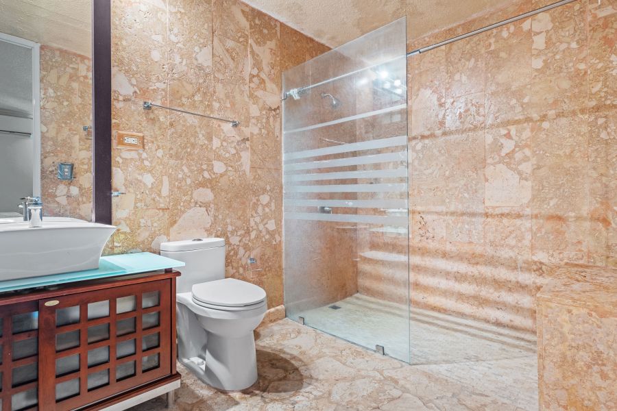 The master bedroom features a spacious layout with a broad walk-in closet and a luxurious ensuite with walls and floors covered with coral stone.